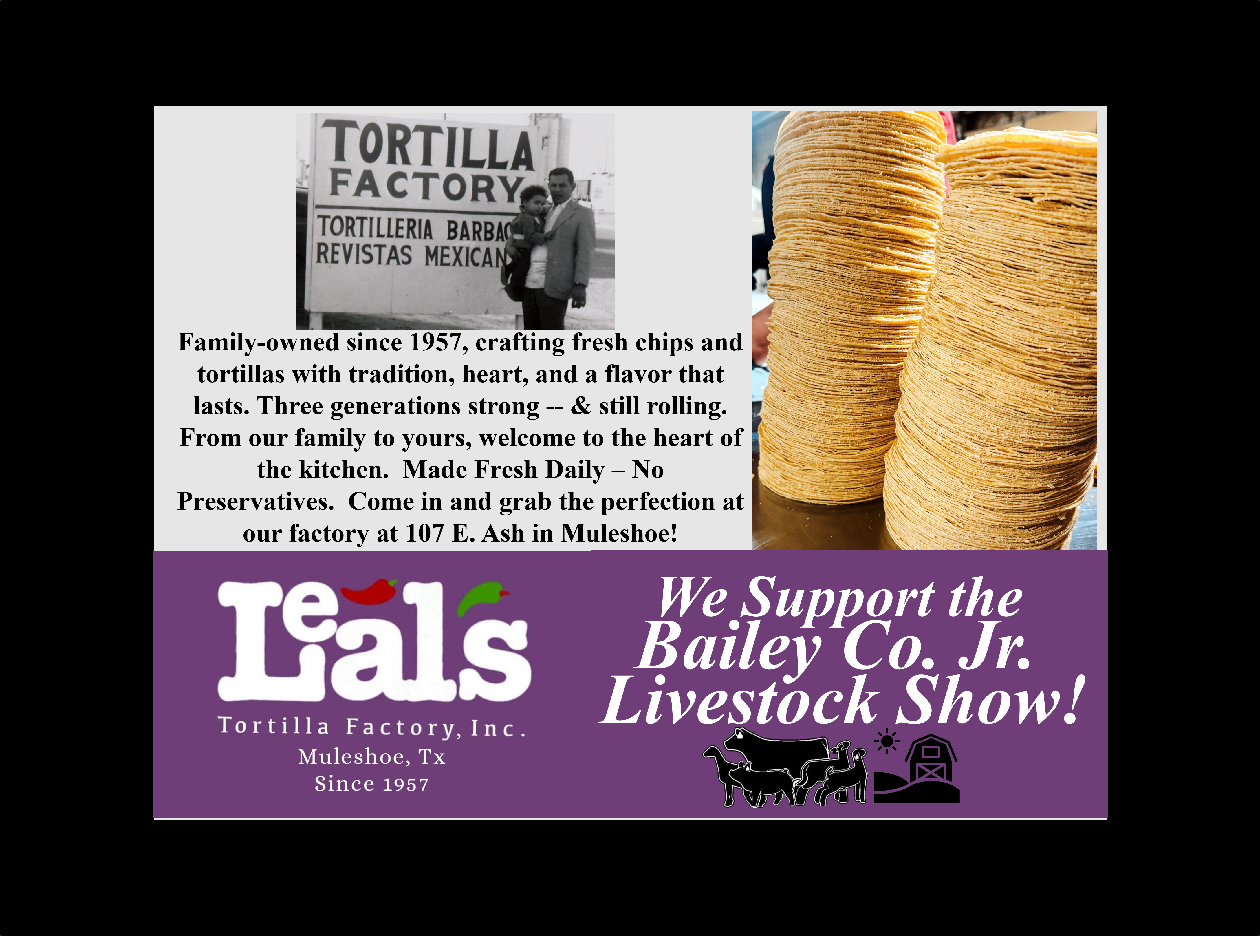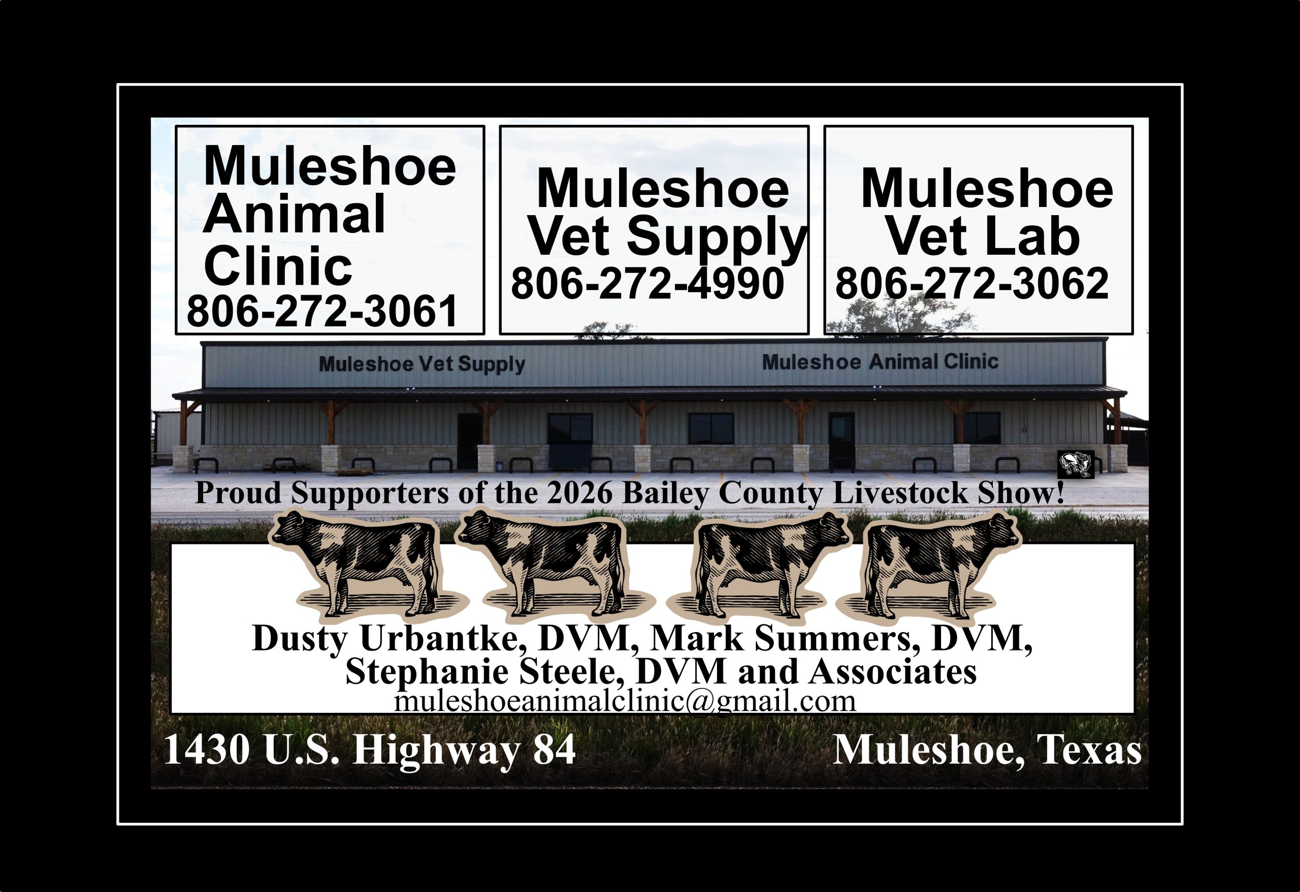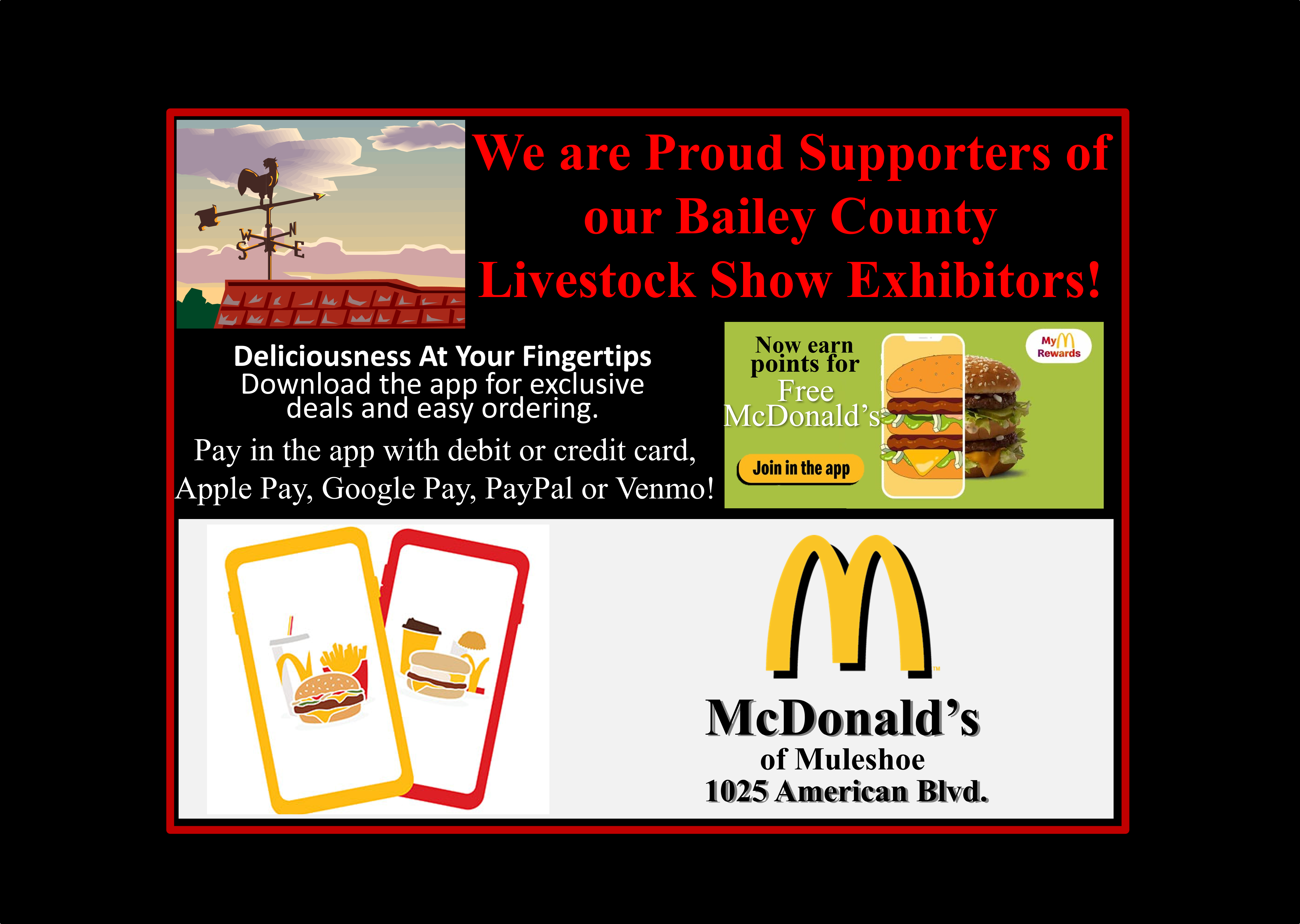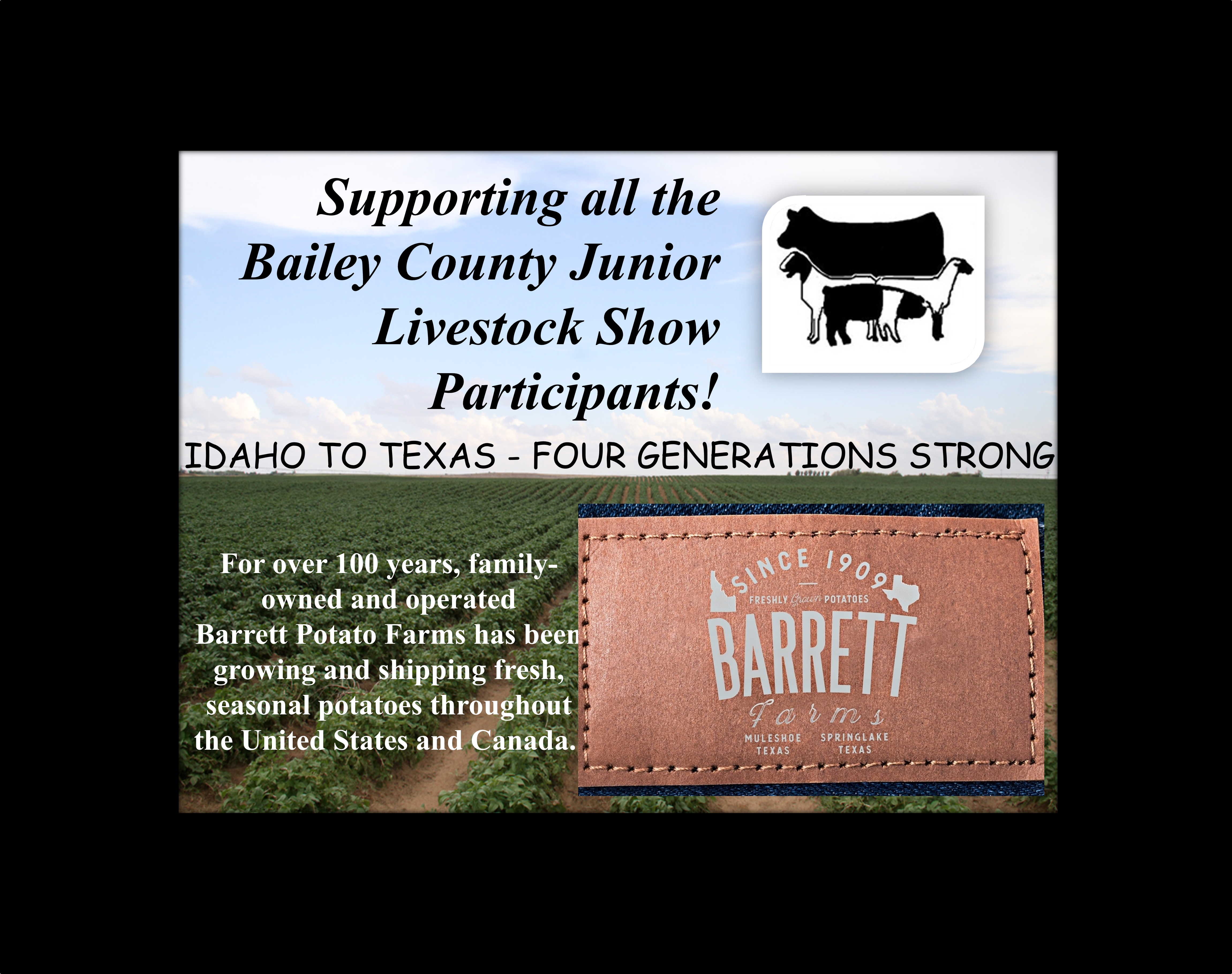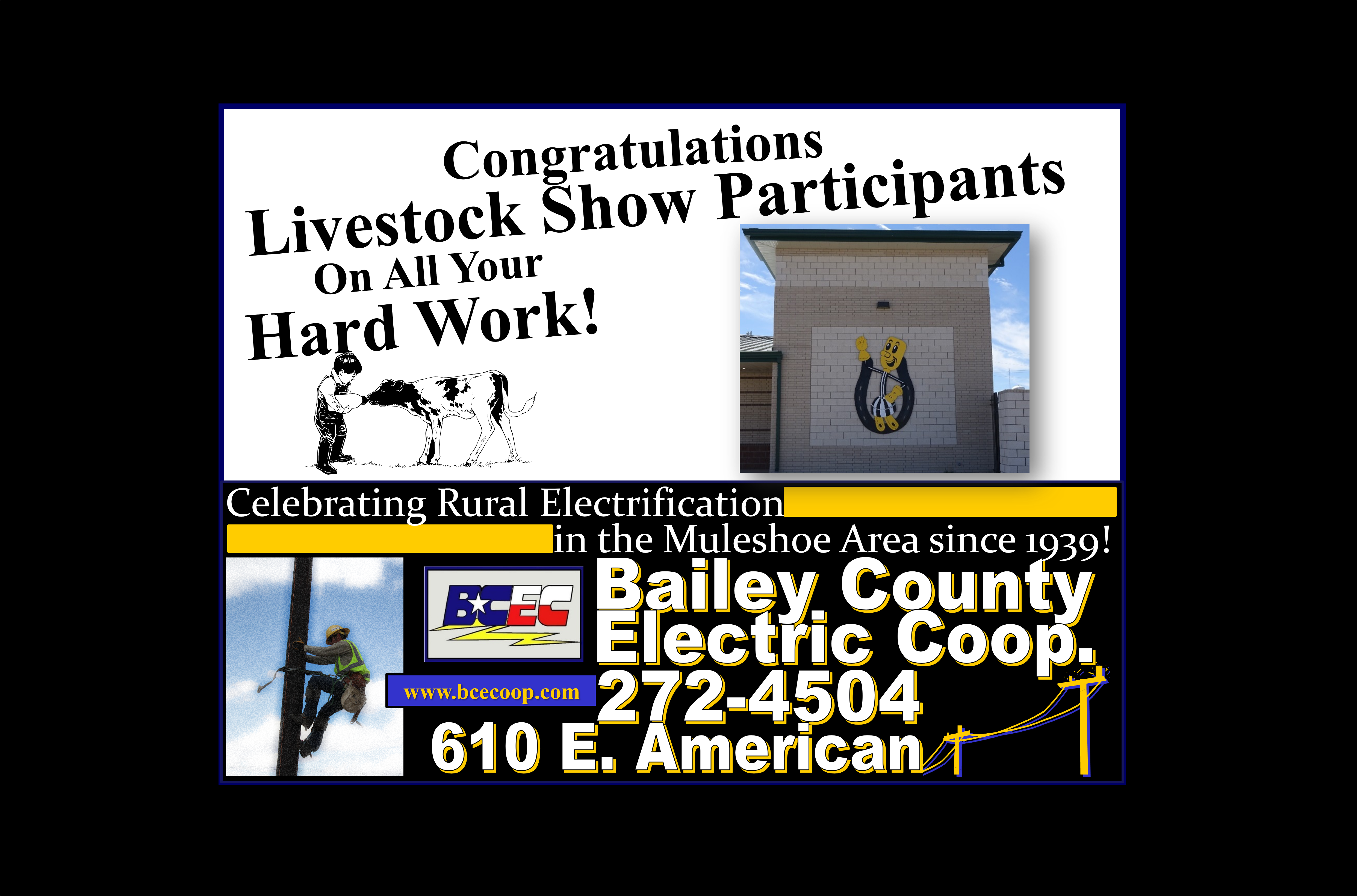 See the Livestream of the 2026 Bailey County Junior Livestock Show beginning at 7:50a.m. on Friday, January 23rd, from the Bailey County Coliseum in Muleshoe, Texas. Gil Lamb Advertising coverage of the livestock show is brought to you by Barrett Potato Farms, Bailey County Electric, Burton Service Center, Dale Oil Company, Irrigation Pumps and Power, Hi-Tek Automotive, McCormick Seeds, Muleshoe Animal Clinic/Vet Supply, Mohawk Auto Parts, Muleshoe Housing Authority, Precure Electric, Shipman’s Body Shop/Autoplex, Muleshoe Area Medical Center, Muleshoe Livestock Auction, Muleshoe ISD, Five Area Telephone/West Plains Telecom, McDonald’s Restaurant, TG Fuels, Leal’s Tortilla Factory, Bamert Seed, Muleshoe Feed Barn and Randall Field CPA.